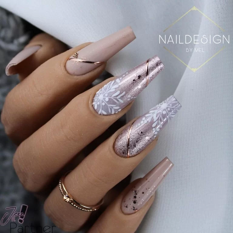 Flocked nails look like soft snow. Nude shades keep the look clean and simple. White raised designs add texture and charm.