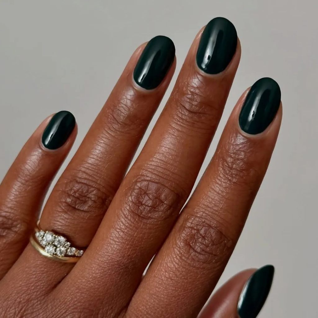 Glossy green nails never fail. The smooth finish looks clean and rich. Simple nails can still feel special.