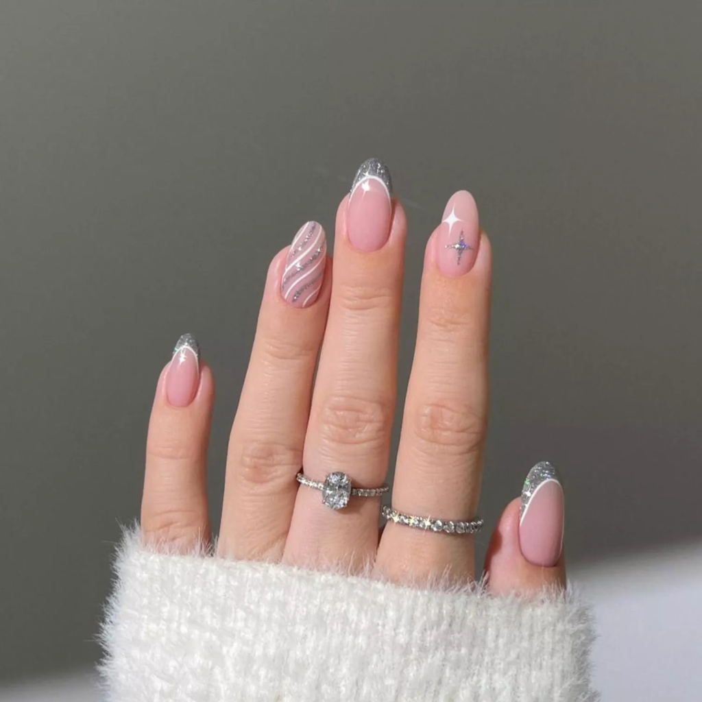 Mix silver and white designs together. Try stars, swirls, and French tips. This look works from Christmas to New Year.