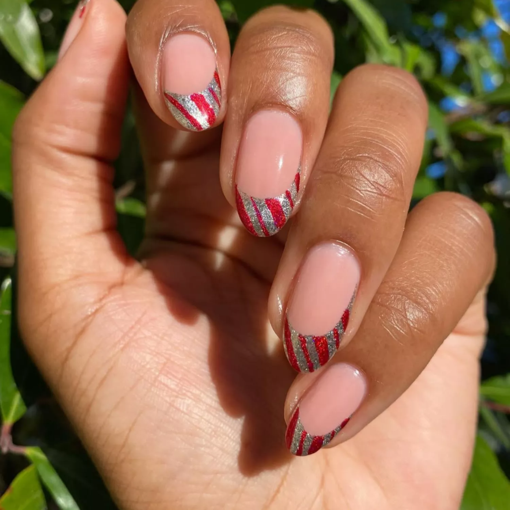 Start with silver French tips. Add red diagonal lines on top. Just like candy canes, sweet and simple.