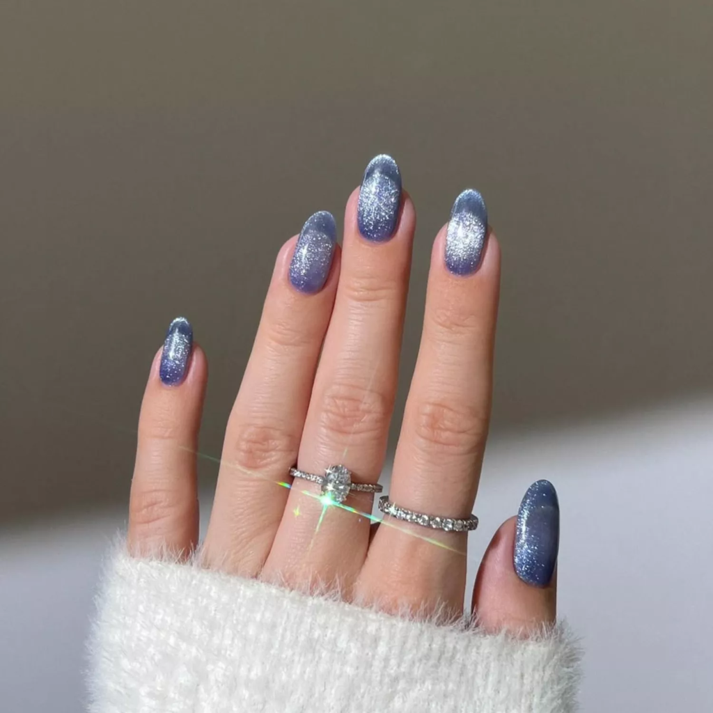 This icy blue shade feels like winter. Magnetic polish gives a soft French tip effect. The finish looks dreamy and cool.