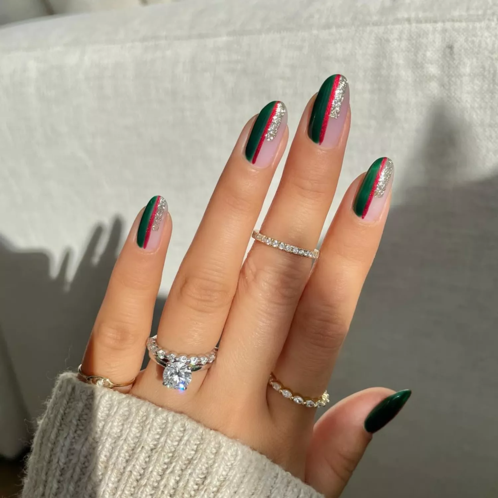 This look uses classic holiday colors in a clean way. Paint one side green and the other side glittery. Add a thin red line in the center for a festive touch.