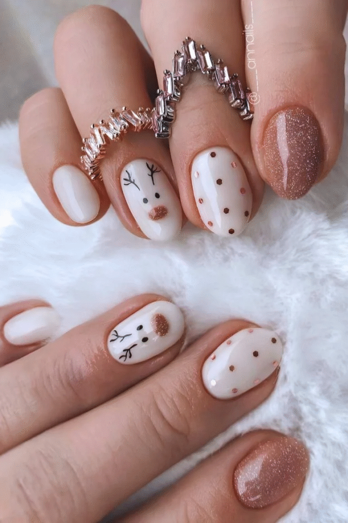 Milky white and glittery brown nails feel cozy. Add reindeer and gold dots for detail. Great for neutral lovers.