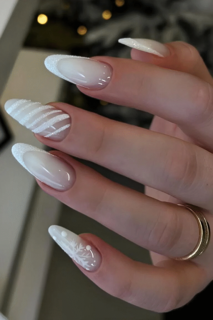 White to clear ombre nails feel icy and soft. Snowflake art makes them look dreamy and winter themed. This style screams snow queen vibes.