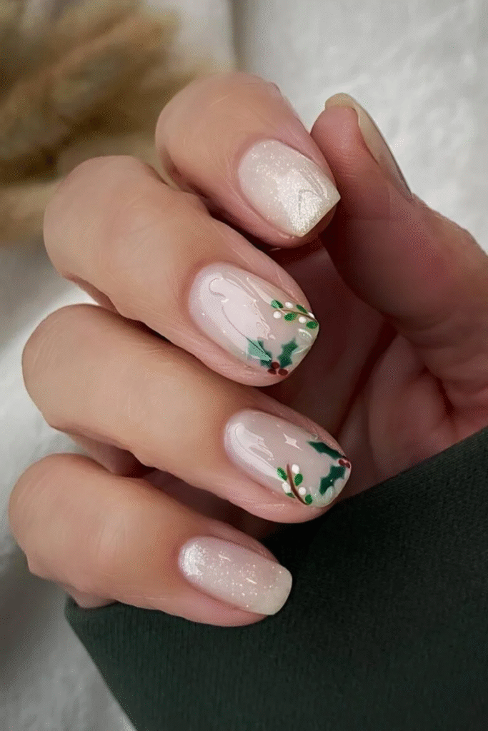 Milky white nails with mistletoe and holly details feel sweet. You do not need bold colors to feel festive. Small green accents do all the work.