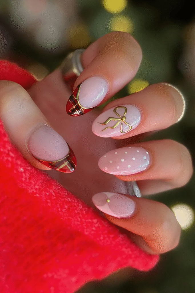 Plaid details on white nails feel cozy and winter ready. Add polka dots and tiny bows to boost the holiday mood. It looks like a cute Christmas movie on your nails.