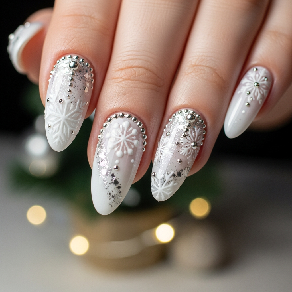 White nails with pearl swirl effects look elegant. Silver snowflakes add winter charm. These nails work for every holiday event.