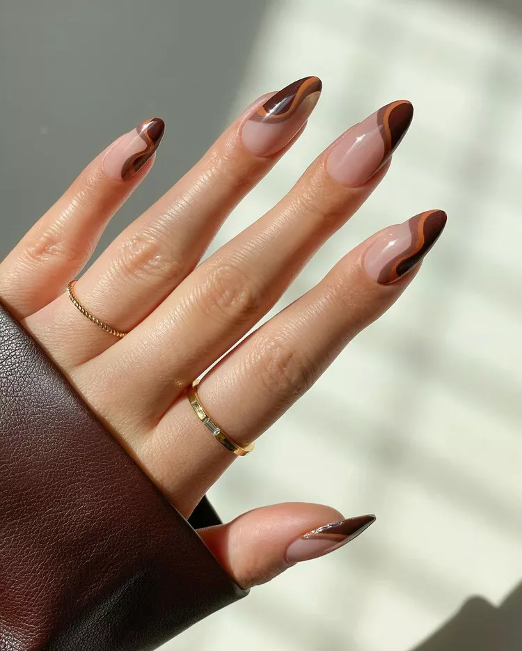 This manicure features asymmetrical, wavy brown tips with a 3D effect. The depth and texture make the nails look artistic and unique.
