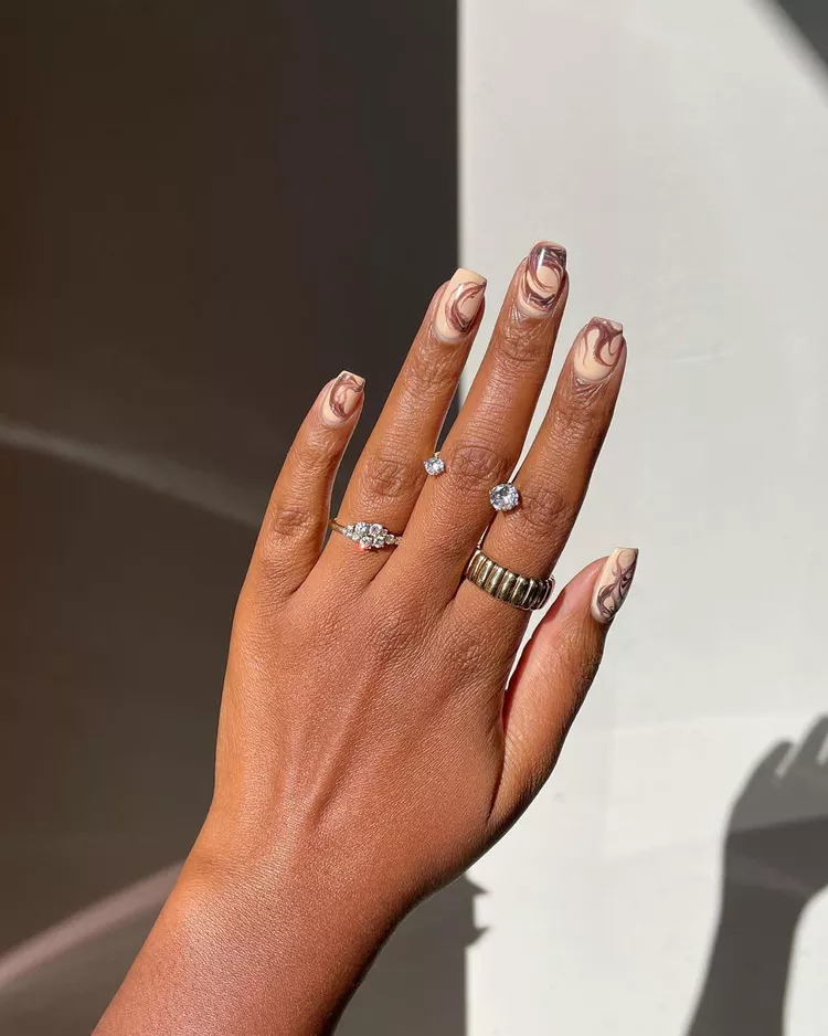 For something creative and eye-catching, go for a marble coffee look. Start with a soft cream base, then swirl dark brown polish over it to mimic the swirls of coffee. It’s a fun and unique way to showcase espresso brown nails.