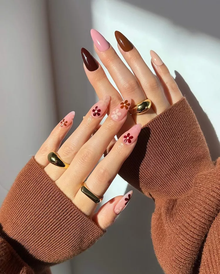 Espresso brown nails blend beautifully with delicate fall florals. One hand features charming flowers, while the other keeps things simple with a solid espresso ombré. It’s a perfect mix of whimsy and elegance.