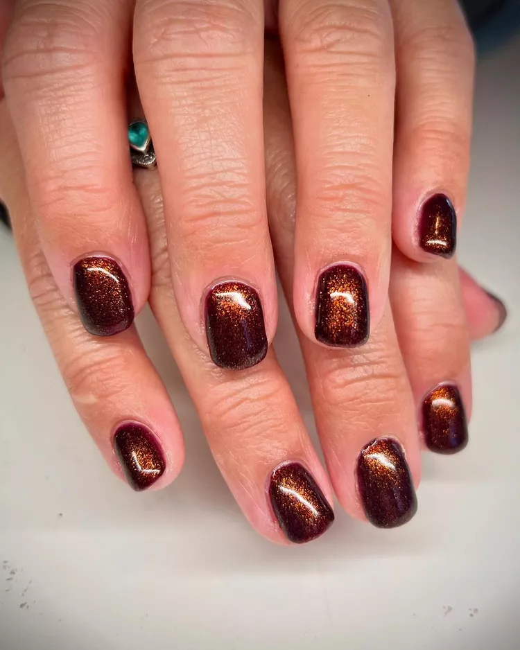 Want some extra sparkle? Try using a rich bronze glitter polish. It gives your nails a touch of glamour that’s perfect for the fall season.