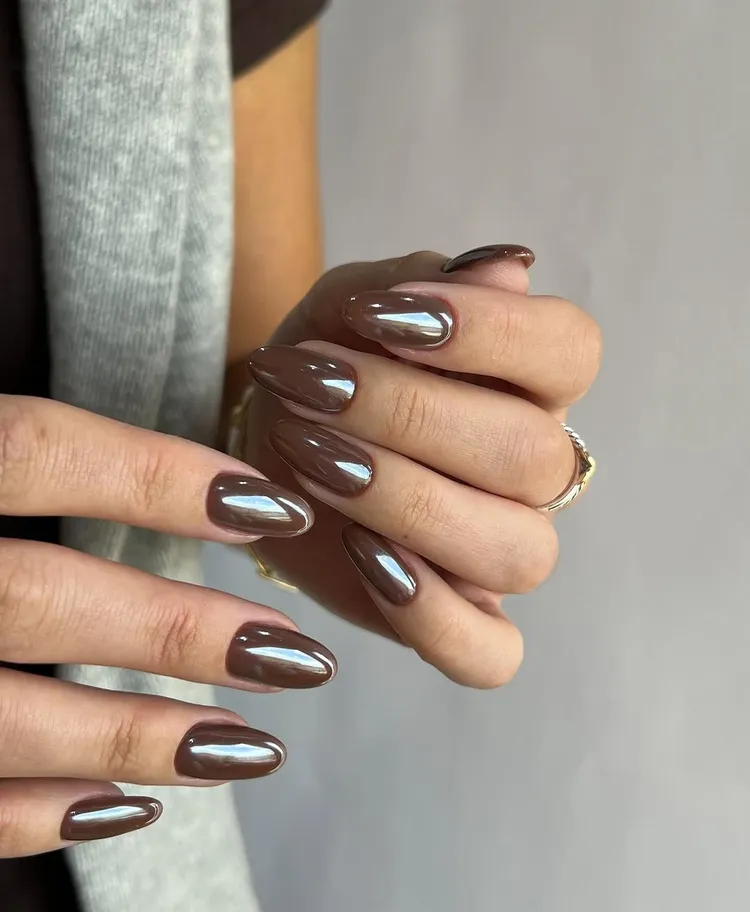 Top your espresso nails with chrome powder for a frosty, cool-toned look. The chrome finish adds extra depth and shine, making your nails stand out.