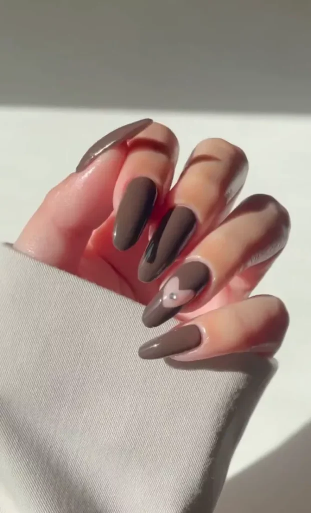 A heart design on the ring finger adds a playful touch to your espresso nails. A little rhinestone in the center brings extra sparkle to the design.