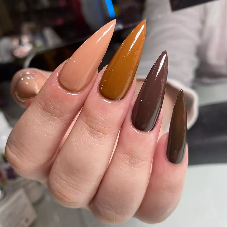 This design features a blend of classic brown shades and lighter, creamier tones. It’s a modern take on espresso brown nails that’s perfect for fall.