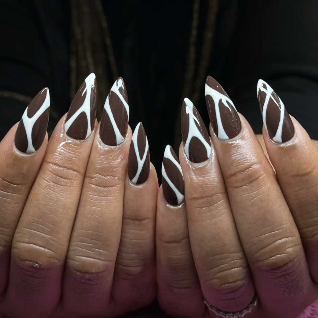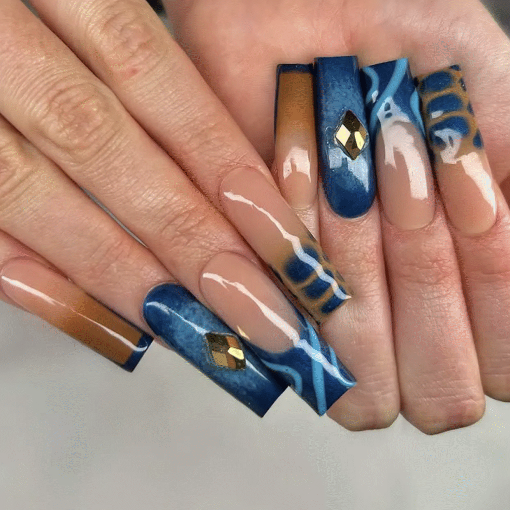 If you like long nails, this one’s for you. Blue and brown look stunning on coffin-shaped nails. Add a tie-dye effect to make them even bolder.