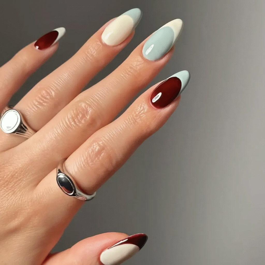 This style keeps part of your nails bare for a modern look. Combine blue, brown, and cream on different nails. It’s clean, creative, and very trendy.