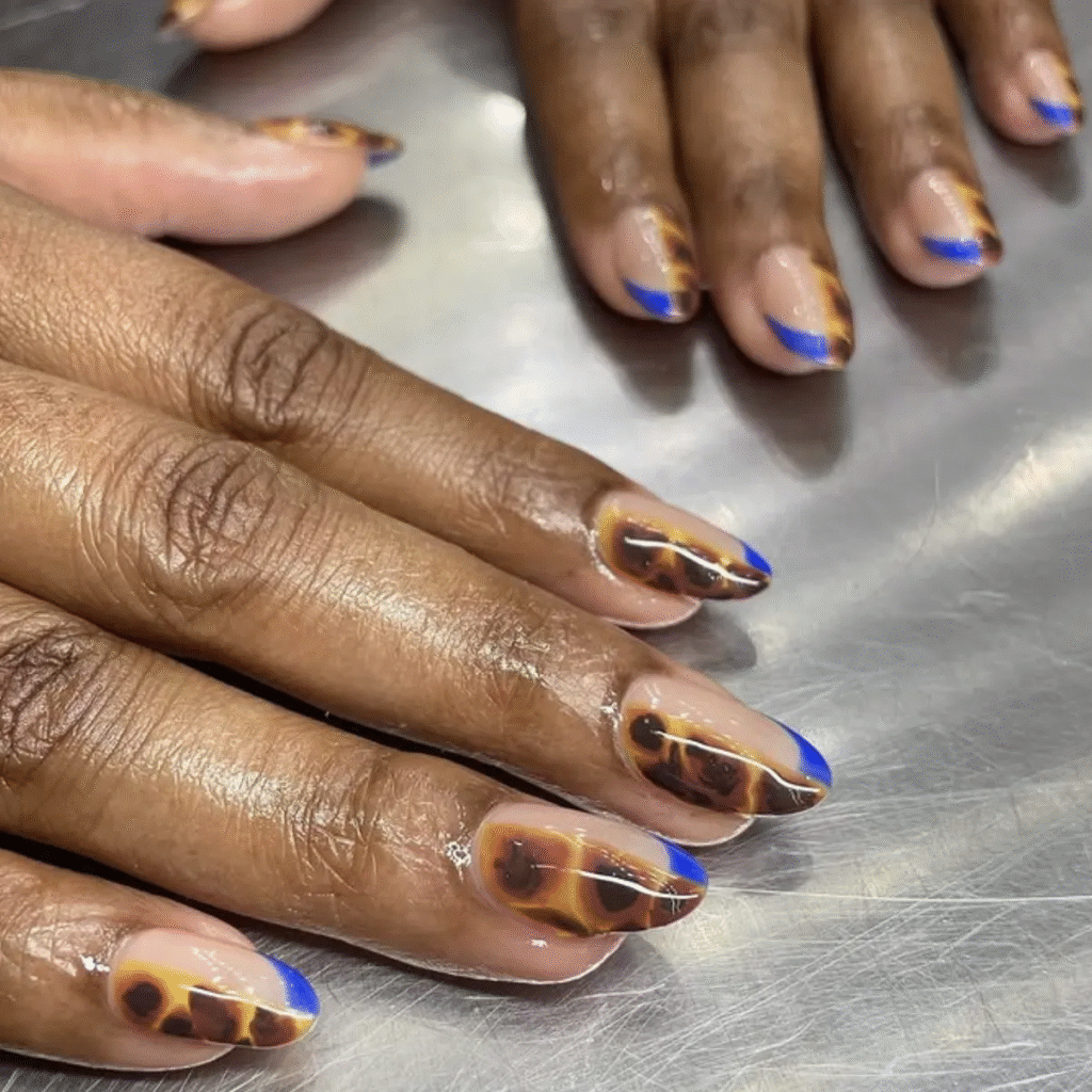 Mix tortoiseshell brown with electric blue French tips. The result is bold and unique. It looks amazing even on short nails.