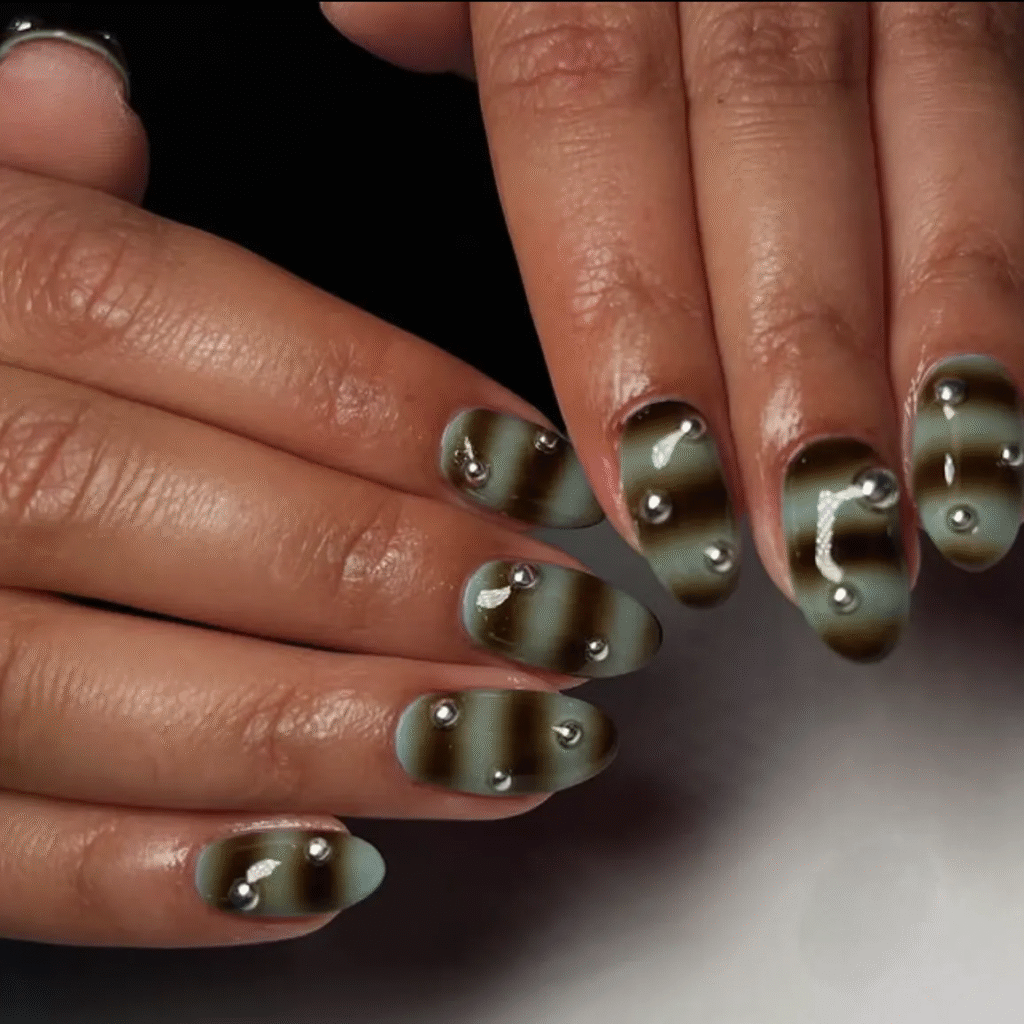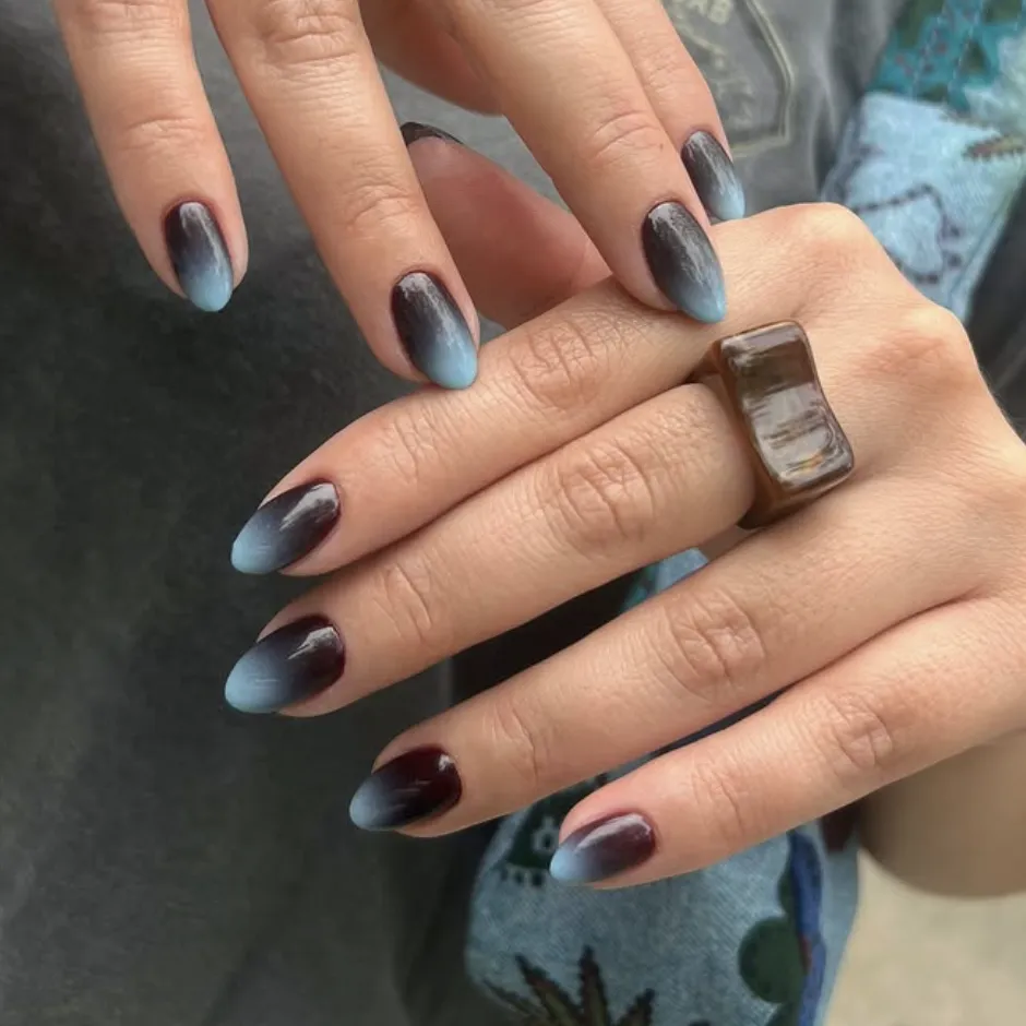 Blend blue and brown together for a smooth ombre effect. The colors melt softly into each other. It’s dreamy and works great on almond-shaped nails.