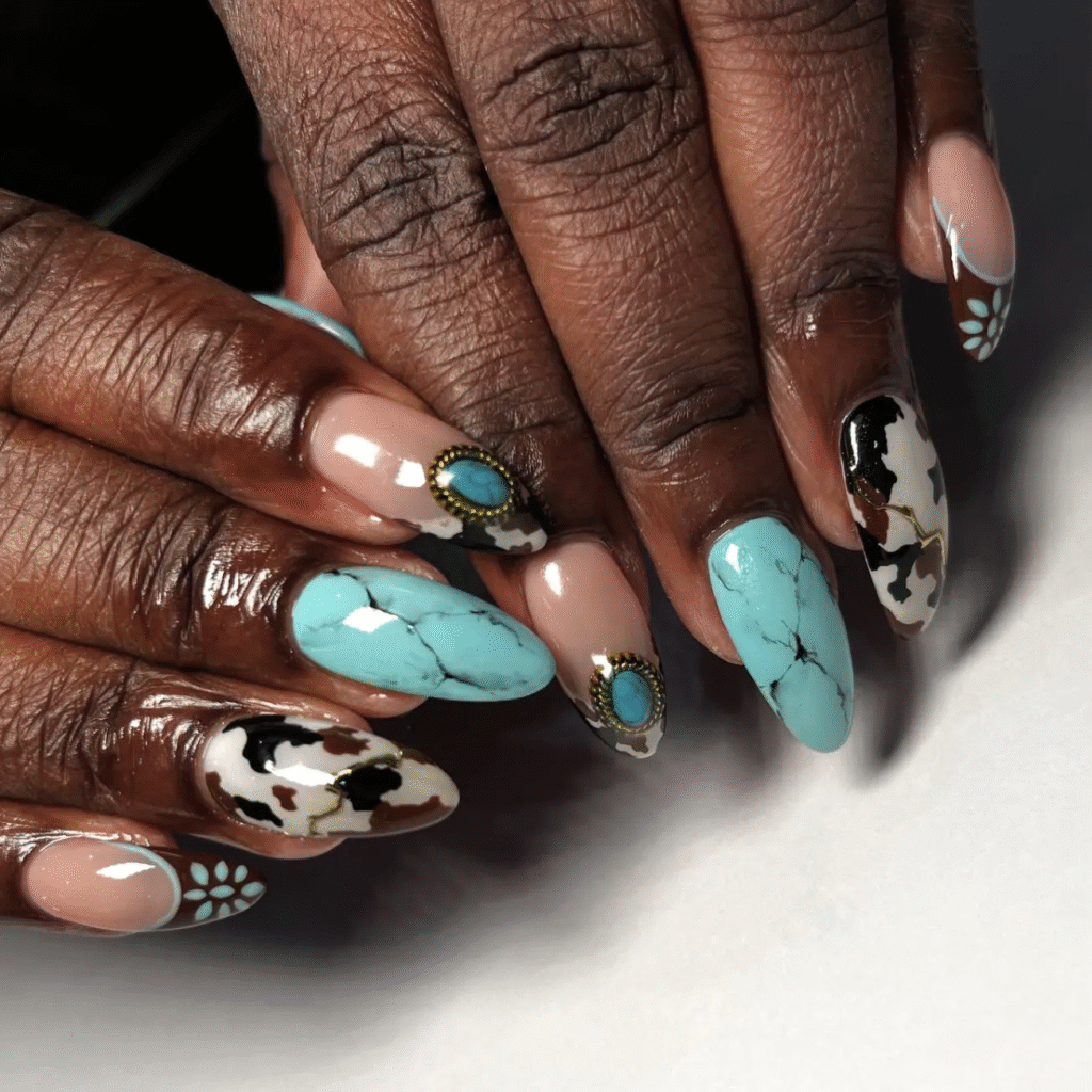 This design gives a cool western feel. It mixes turquoise blue, brown, and animal print. It’s bold and stylish, perfect if you like something different.