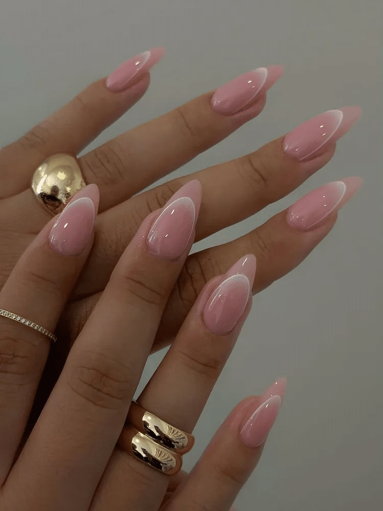 This look is soft, pink, and classy. It’s close to the traditional French manicure but with a twist — the white arc floats above the nail tip. The almond shape makes it look elegant and delicate. It’s a great choice for anyone who wants something simple yet different.