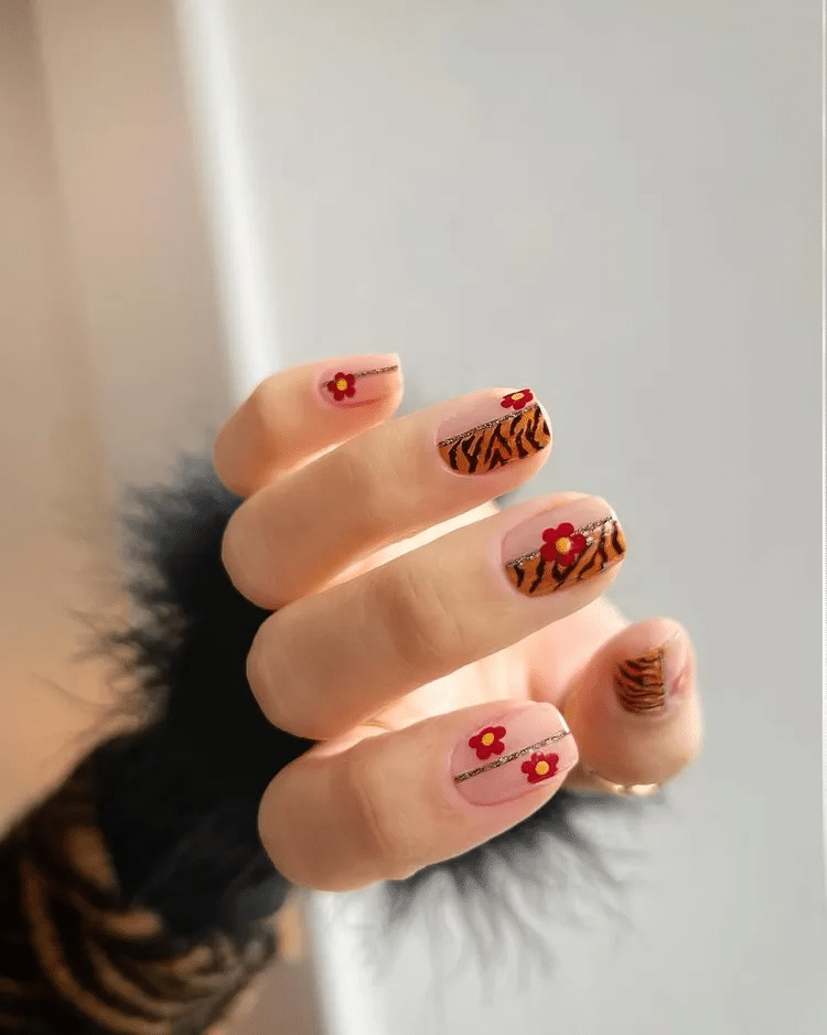 This design mixes bold red flowers, black glitter stripes, and tiger patterns on a beige base. It’s a mix of wild and stylish. The floating design keeps it modern while the animal print adds attitude. Perfect for when you want your nails to stand out.