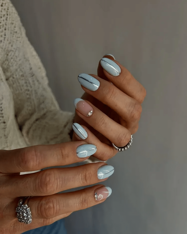 Soft blue nails with floating silver chrome lines look calm and fresh. The shiny touch adds elegance, especially on the ring finger. It’s a dreamy and light manicure that works well for weddings or spring events.