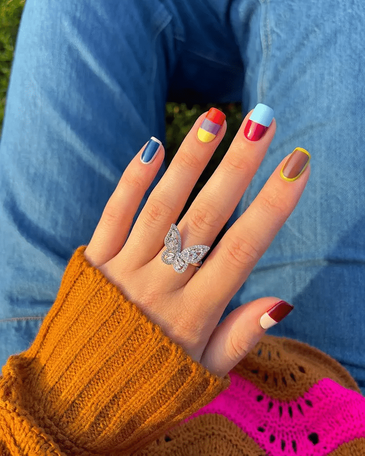 If you can’t pick one color, try a few. This style uses blue, yellow, and orange lines together. The nude base keeps it balanced and elegant. It’s bright, fun, and stylish — perfect for when you want something cheerful but not loud.