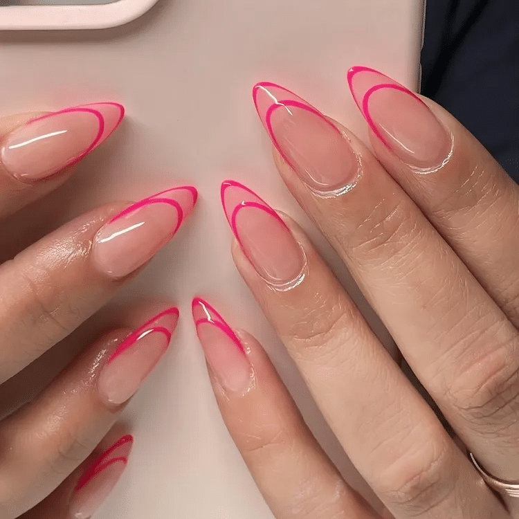 A nude base with floating hot pink lines looks playful and cute. It’s shiny and gives a jelly-like effect, just like 90s jelly shoes. It’s perfect for casual days when you want your nails to look fun and light.