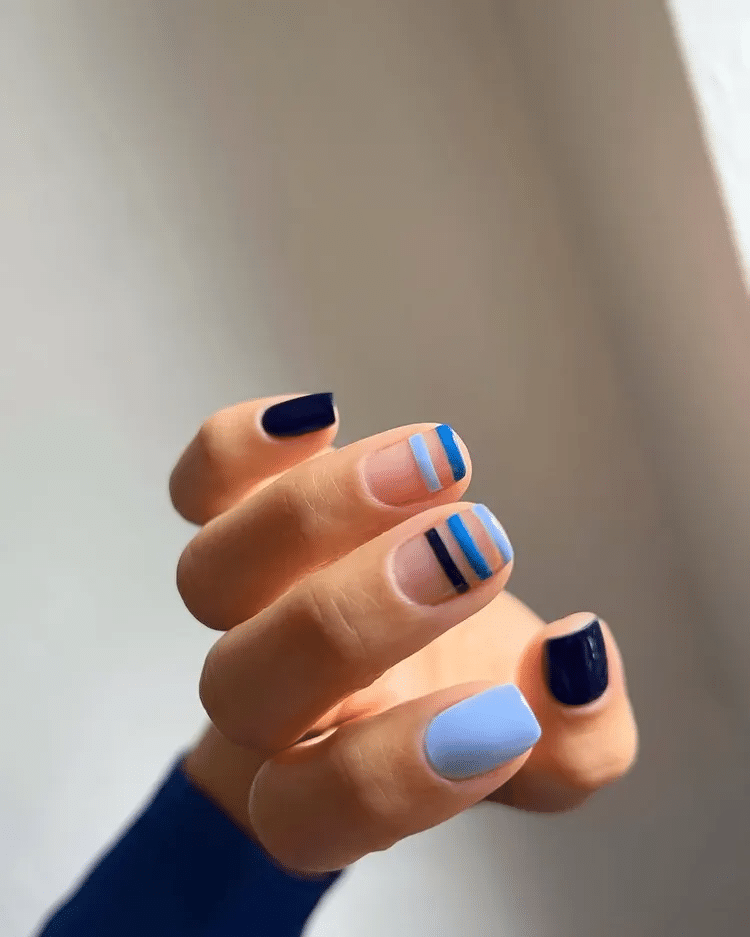 Different shades of blue — sky, navy, and cerulean — float over a clear base. Some nails have stripes, others are solid. The mix gives a preppy, stylish look that feels clean and trendy. It’s a fresh idea that works any time of year.