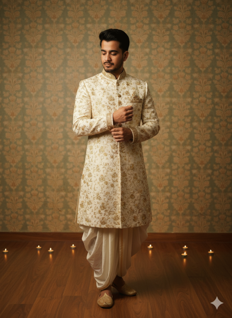 Generate Image of me standing indoors on a wooden floor with small lit candles placed around. The background is a patterned green wall with traditional floral motifs in beige. The man is wearing a cream-white sherwani kurta with golden embroidered floral patterns and borders, paired with white dhoti-style pants. He has a well-groomed beard and styled hair. The model is adjusting his cuff with one hand, looking slightly down to the side in a graceful and composed pose. Lighting is warm, soft, and festive, highlighting the details of the embroidery and creating a traditional, elegant atmosphere