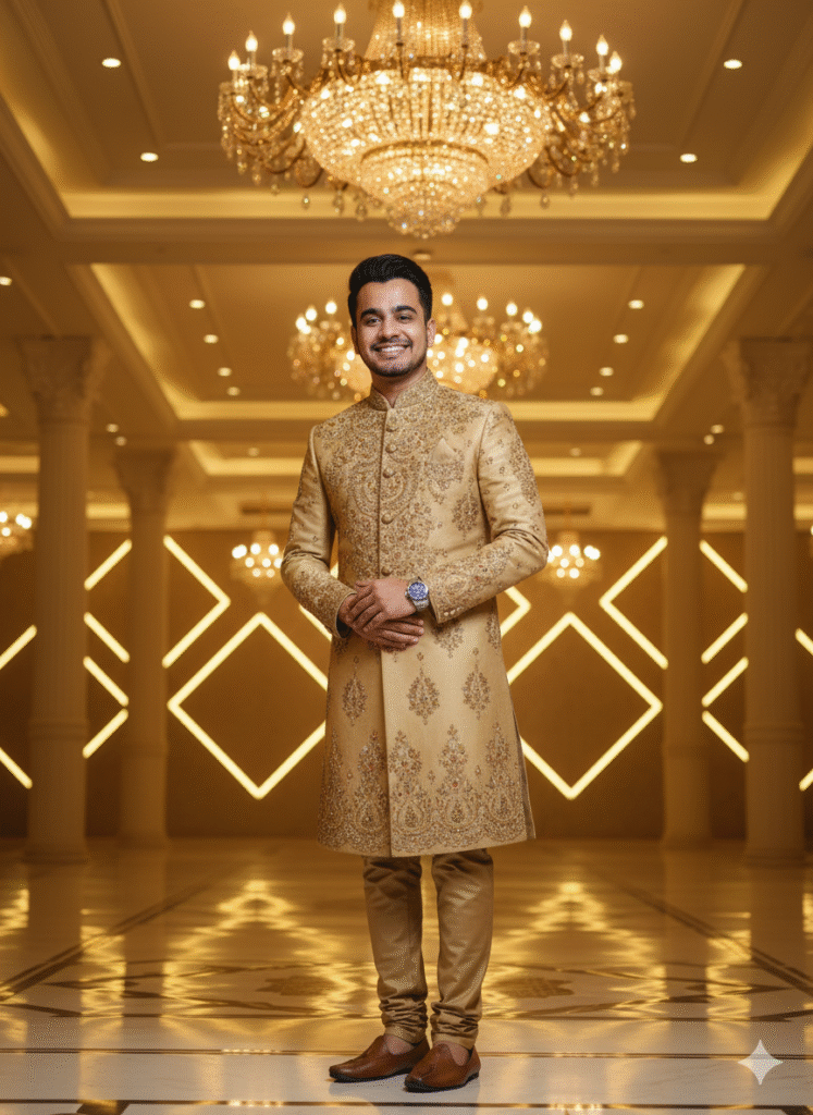 Generate Image of me smiling male, standing indoors in a luxurious, well-lit hall with chandeliers hanging from the ceiling and illuminated diamond-shaped light frames in the background. He is wearing an elegant golden-beige sherwani with intricate embroidery, paired with matching churidar pants. The model has neatly styled black hair and a clean look, accessorized with a wristwatch. He is holding his hands together in a natural, cheerful pose, slightly leaning forward. Lighting is warm, golden, and festive, highlighting the embroidery on the outfit and creating a glamorous wedding-event atmosphere