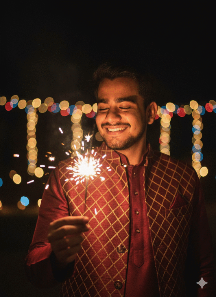 Create a high-quality, festive portrait of me during a Diwali celebration. I’m wearing a stylish maroon traditional Indian outfit with a diamond-checkered jacket. I’m smiling with my eyes closed and looking slightly to my left. My right hand is holding a lit sparkler, which is emitting bright, glowing sparks. The background is dark with soft-focus bokeh lights to create a vibrant, night-time festive atmosphere. Use cinematic lighting and ensure the sparkler’s light reflects naturally on my face and outfit. The overall mood should be joyful, warm, and celebratory, with a rich festive aesthetic