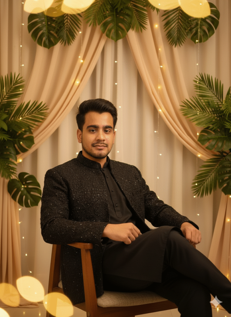 A young man with styled short hair and a sharp, confident look is sitting on a chair in a relaxed pose. He is leaning slightly back with his torso turned slightly toward the camera. His right arm rests casually on his knee, while his left arm rests on the chair arm. He is wearing a black embroidered kurta with a matching black embellished jacket, giving a festive and elegant appearance. His legs are relaxed, one bent naturally, the other slightly extended. The background is decorated with beige drapes, warm golden fairy lights, and tropical green leaves. Soft warm lighting highlights his face and outfit, with an elegant and cinematic festive mood. Ultra-realistic DSLR portrait, 50mm lens, shallow depth of field, golden glow
