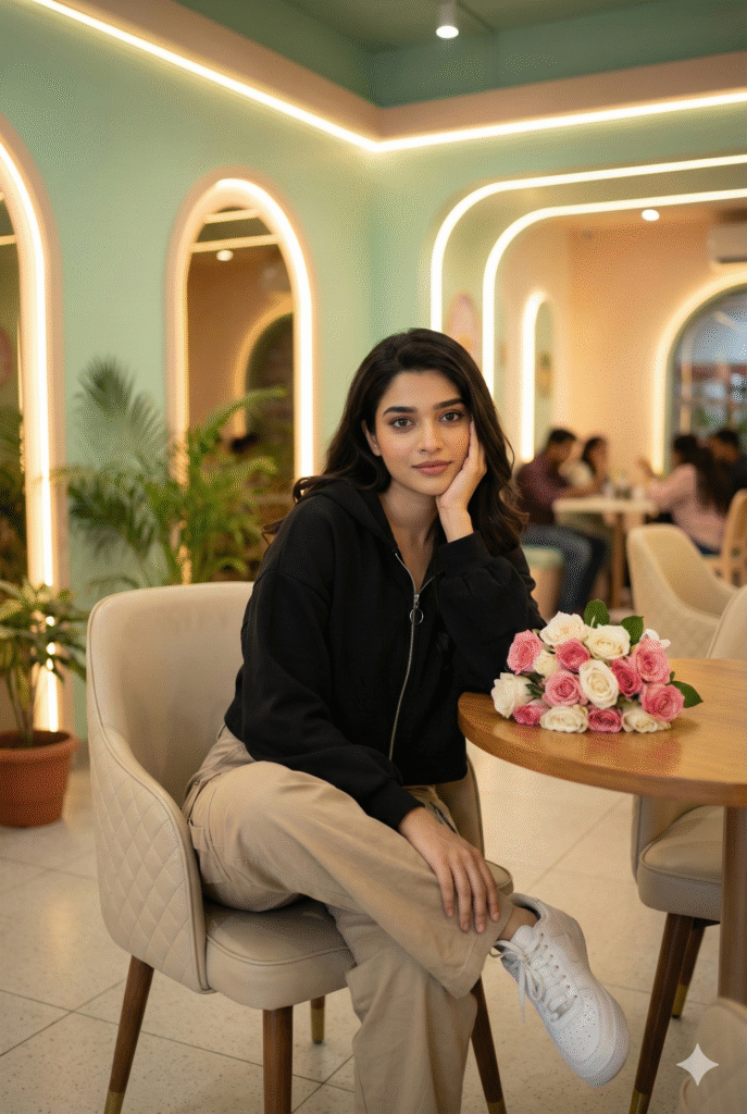 reate a image 8k Ultra-realistic Create “A stylish beautiful girl 18-year-old sitting casually in a pastel-green modern cafĂ© interior, seated on a light quilted chair with one leg crossed. She is wearing a clothes in the image 2 , don’t change the face. A bouquet of roses is placed on the table in front of him. He is posing with a relaxed attitude, leaning slightly to one side and touching his face with one hand. The cafĂ© has soft neon lighting, warm ambient glow, round arc