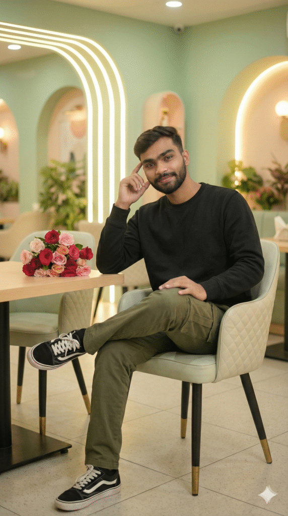 reate a image 8k Ultra-realistic Create “A stylish beautiful BOY 18-year-old sitting casually in a pastel-green modern cafĂ© interior, seated on a light quilted chair with one leg crossed. HE is wearing a clothes in the image 2 , don’t change the face. A bouquet of roses is placed on the table in front of him. He is posing with a relaxed attitude, leaning slightly to one side and touching his face with one hand. The cafĂ© has soft neon lighting, warm ambient glow, round arc. 9:16 RATION