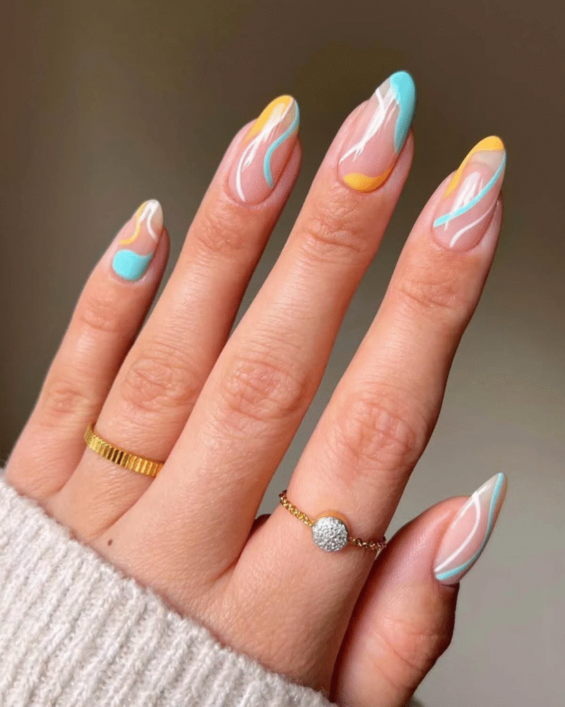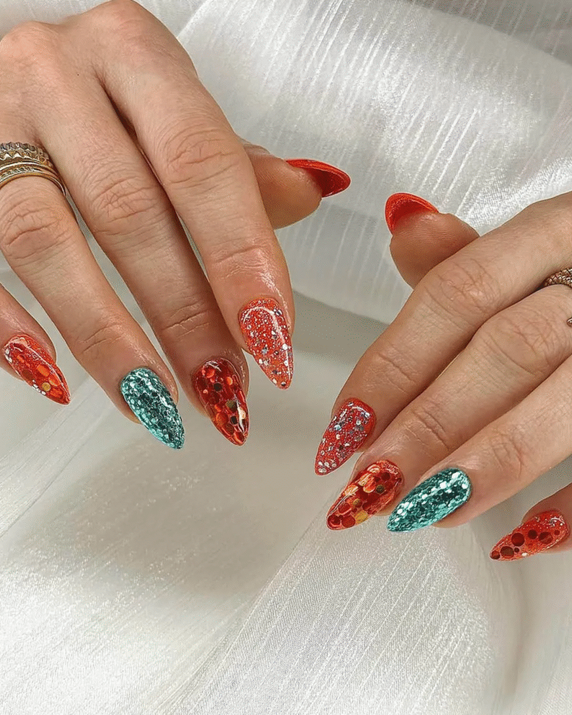 From dazzling sequins to sparkling rhinestones, and the vibrant aqua-orange palette, there’s a lot of inspiration for your nails. Whether you’re a Swiftie or just love a good beauty trend, this album’s aesthetic is perfect for showcasing on your nails. It’s not just about painting your nails; it’s about making a statement, celebrating Taylor’s newest journey, and connecting with fellow fans.