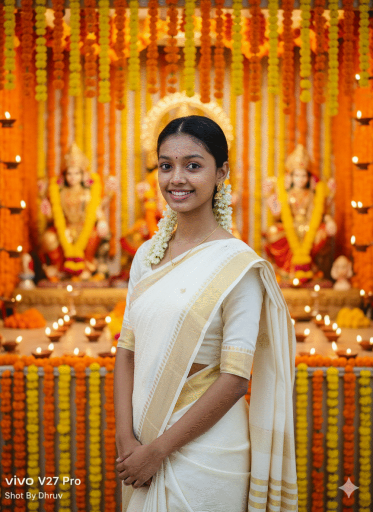 A photorealistic portrait of me wearing a white silk saree with a golden border, natural lighting, subtle makeup, jasmine flowers in her hair, standing in front of a Navratri pandal decorated with marigolds and diyas.