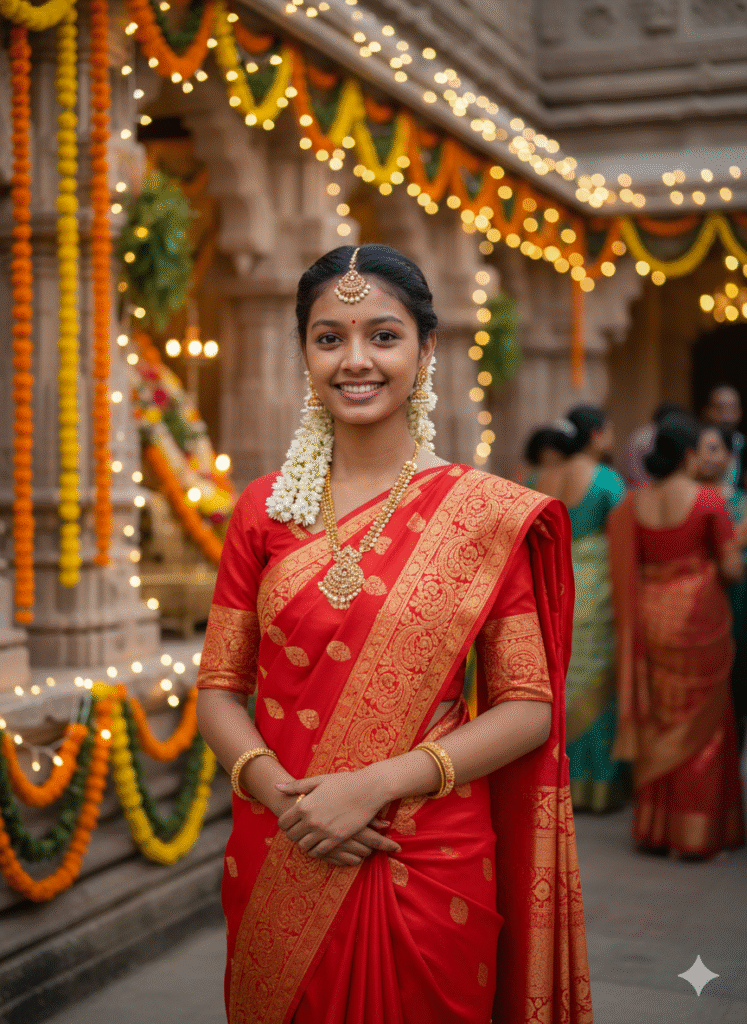 A realistic photograph of me in a bright red saree with golden embroidery, traditional jewelry, candid smile, standing in a temple courtyard during Navratri with festive lights and garlands