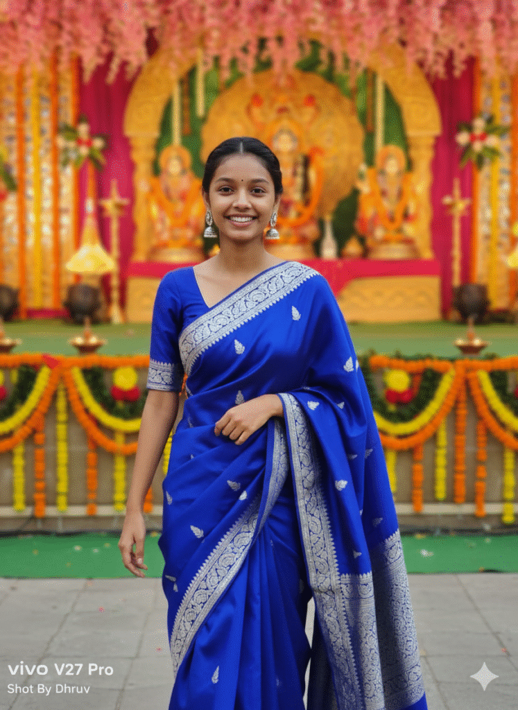 An authentic photo-style image of me dressed in a royal blue silk saree with silver detailing, elegant earrings, candid mid-shot as she walks near a decorated Navratri stage, natural festive lighting.