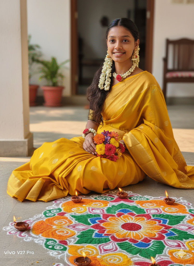 A lifelike image of me in a yellow saree with zari border, wearing fresh flower jewelry, sitting near a rangoli decorated with diyas, warm sunlight falling softly on my face.