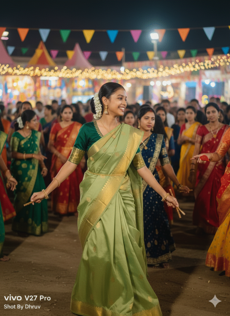 Photorealistic scene of me in a green silk saree with golden work, natural smile, hair tied with jasmine, candid moment while dancing Garba in a crowd, realistic festival background
