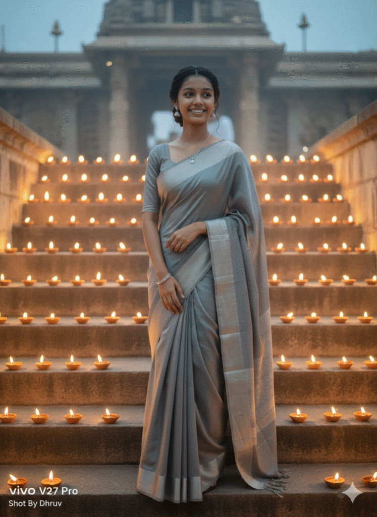 A realistic photo of me wearing a grey saree with silver border, minimal elegant jewelry, standing near a diya-lit temple step in the evening, soft glow from oil lamps.