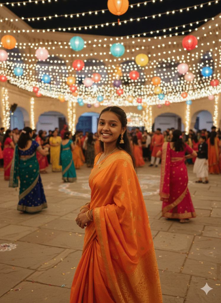 Photo-style image of me in a bright orange saree, candid shot during Garba night in an open-air courtyard with fairy lights and lanterns hanging above, natural festive crowd in background, photorealistic, high-resolution
