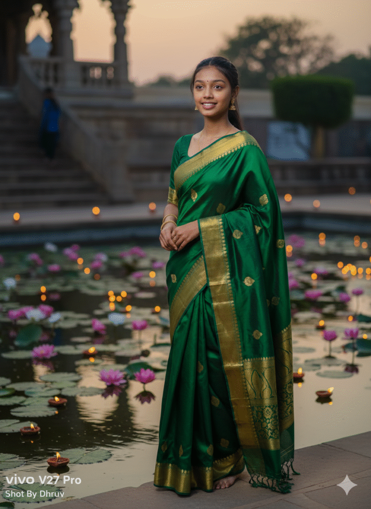A lifelike portrait of a woman wearing a peacock green silk saree with embroidered border, standing near a serene temple pond surrounded by lotus flowers and diyas floating on the water, twilight sky with soft golden glow, DSLR-style realism.