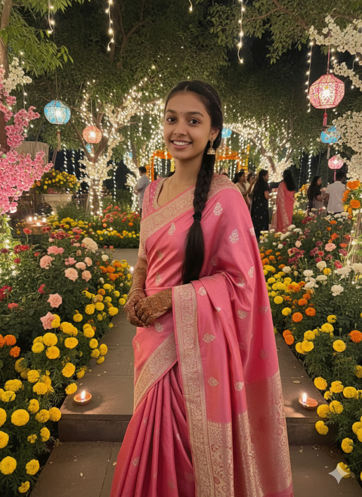 A realistic Navratri scene of me in a pink saree with silver detailing, henna on her hands, candid smile as she stands in a lush garden with blooming flowers and decorative lanterns, evening festive lighting creating a warm glow, high-resolution photorealism
