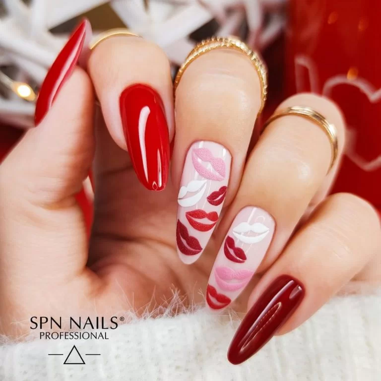 Feature nails are always fun. Mixing colors and designs makes your nails unique. Lip prints are playful and perfect for Valentine’s Day.
