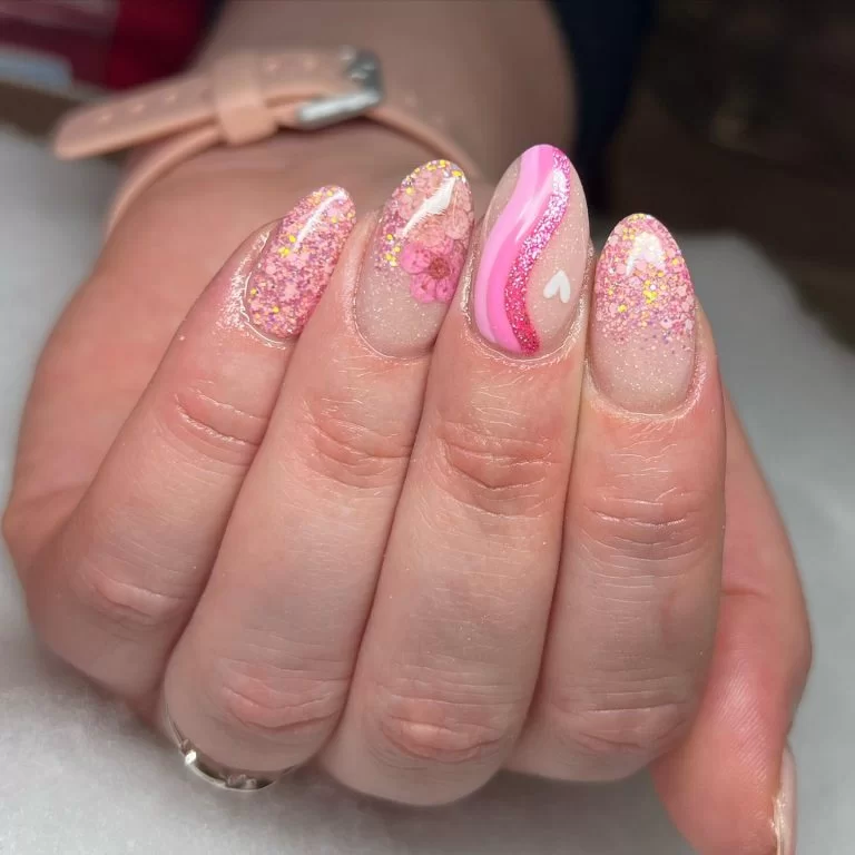 If you love shine, this one is for you. Soft pink sparkles look romantic and sweet. You can also try purple, gold, or silver shades.