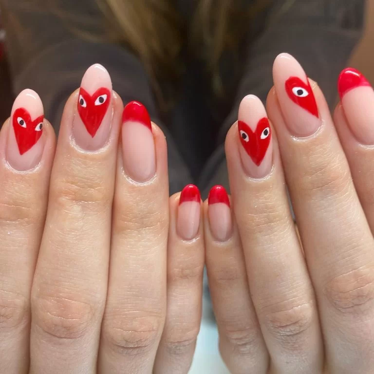 Bright red nails never go out of style. These playful hearts add fun and personality. They feel bold, happy, and full of love.