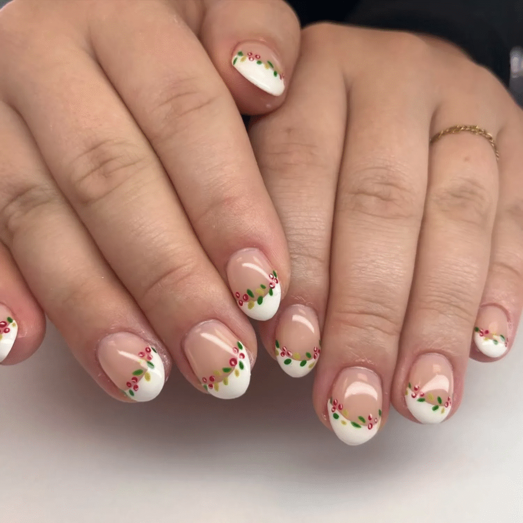 Add holly art under the French tip for a pretty accent. You only need simple dotting tools to make this cute holiday detail.