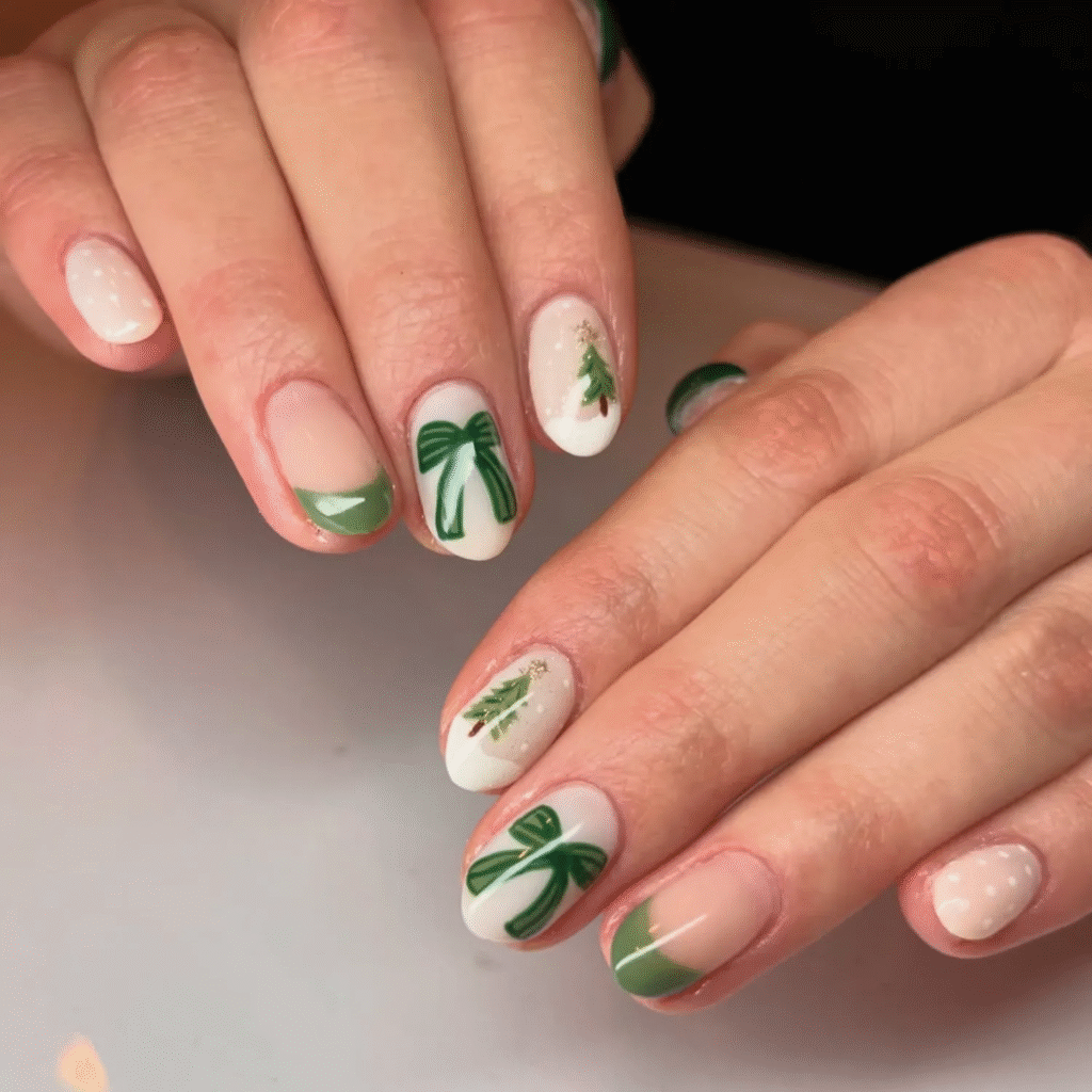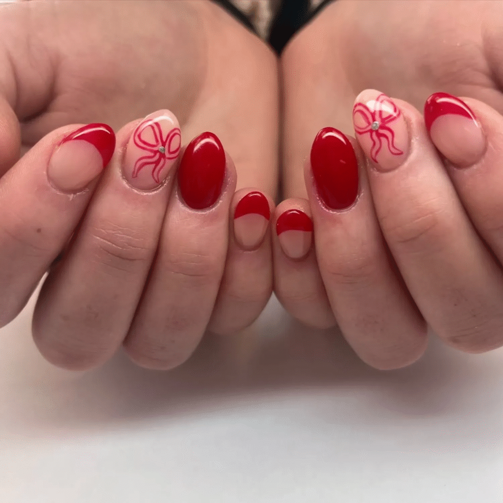 You can stay with one color and still make the nails fun. Red French tips with bow designs create a sweet and holiday-ready look.
